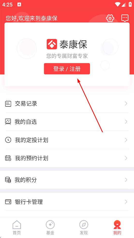 2、进入“我的”页面,点击“登录/注册”,进入欢迎登录泰康保页面。