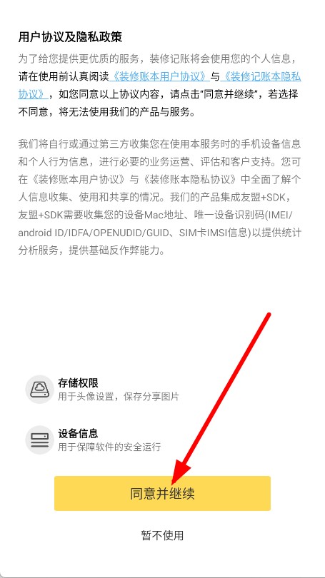 1、打开装修记账,在用户协议页面点击同意并继续。