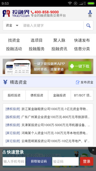 投融界app是一款专业的投资理财,目前平台上投资方以超过110万家,总资产接近3万亿,是一个综合式的投资理财平台,不仅为你提供资金同时也为你提供法律、媒体、平台等全方位服务,中国最优质的投资平台,需要的朋友赶快下载吧!