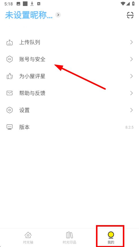 1、打开时光小屋app点击底部中我的图标,进入个人页面后点击账号与安全选项。