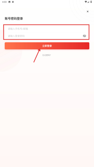4、在账号密码登录页面,输入手机号/邮箱和登录密码后点击立即登录,完成密码登录操作。
