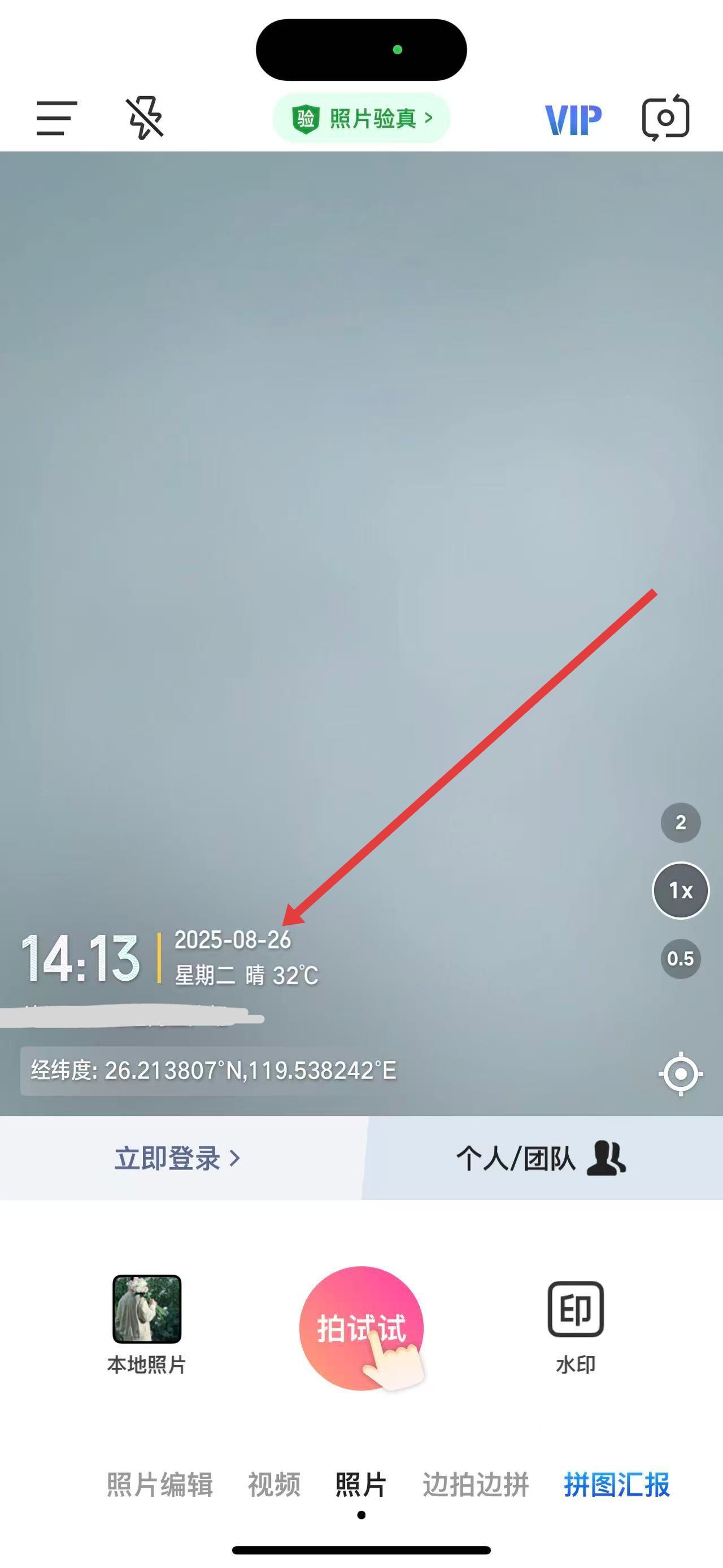 1、打开今日水印相机进入拍摄界面,点击带有时间和天气信息的区域,打开水印编辑选项。