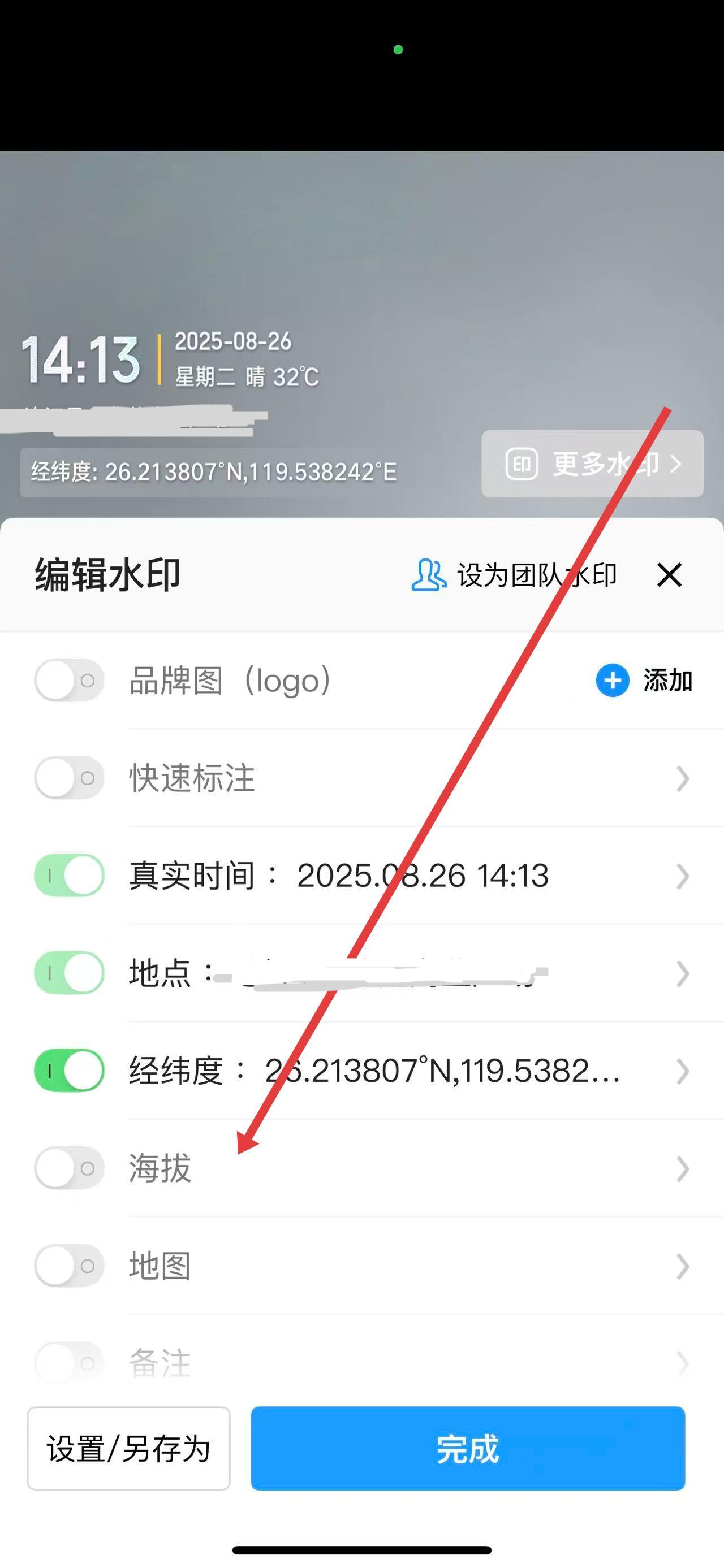 2、在编辑水印界面中,找到海拔选项,点击其右侧的开关按钮将其开启。