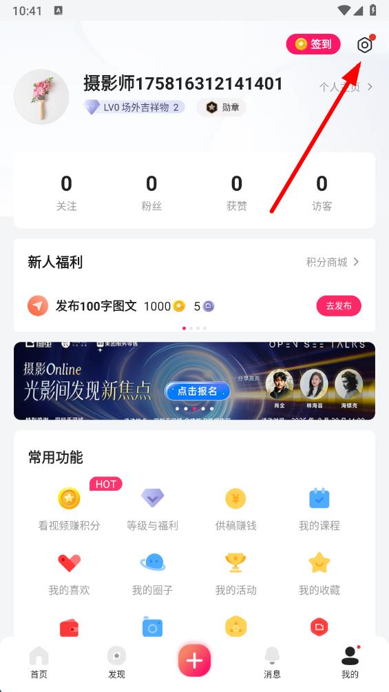 2、在个人页面中,点击右上角的设置图标,进入设置界面。