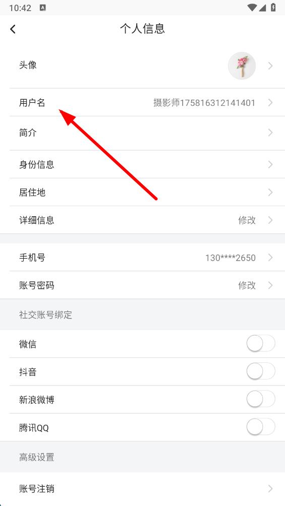4、在个人信息页面,点击用户名,进入用户名修改页面。