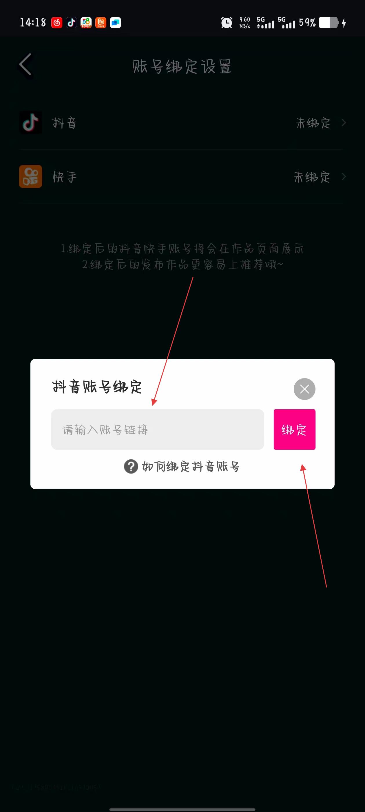 4、在抖音账号绑定窗口的输入框中,输入抖音账号链接,然后点击绑定按钮即可。
