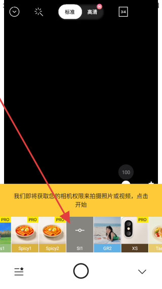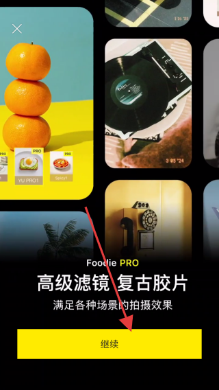 1、在Foodie PRO滤镜介绍页,点击黄色继续按钮,进入相机功能界面。