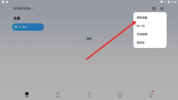 1、在米家的主页面中点击添加设备按钮,添加设备。