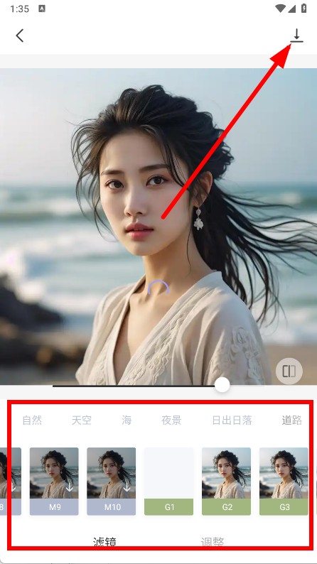 4、选择不同滤镜效果进行调整,调整完成后点击右上角保存按钮,即可保存修图后的照片。
