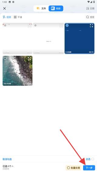2、进入文件选择界面后,勾选需要压缩的视频文件,支持单段或多段视频,确认后点击右下角下一步。