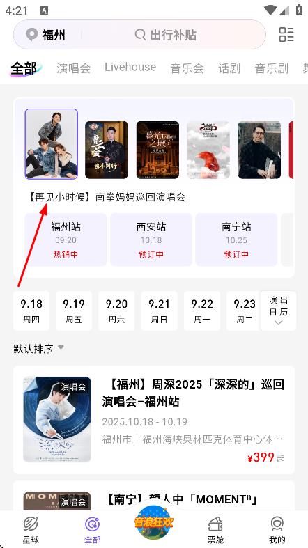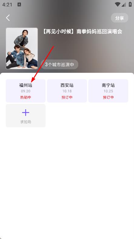 3、在演出详情选择页面,选择演出站点,进入该站点演出页面。