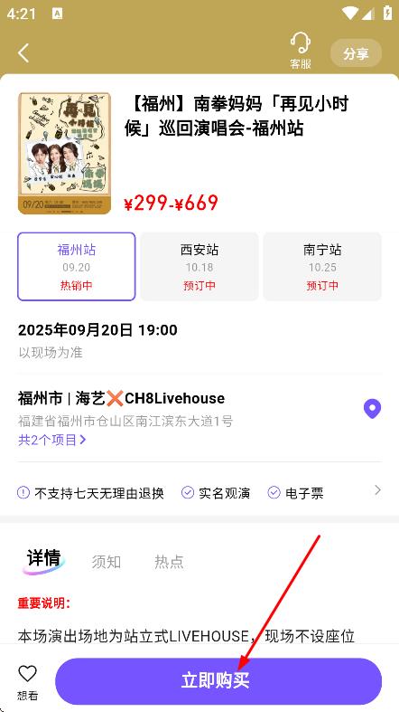 4、在站点演出详情页面,点击立即购买,可购买该场演出门票。
