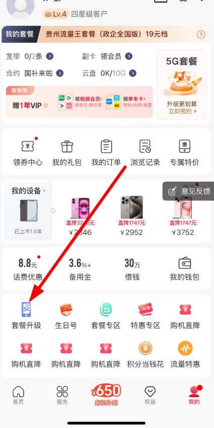 2、在我的页面,点击套餐升级选项。