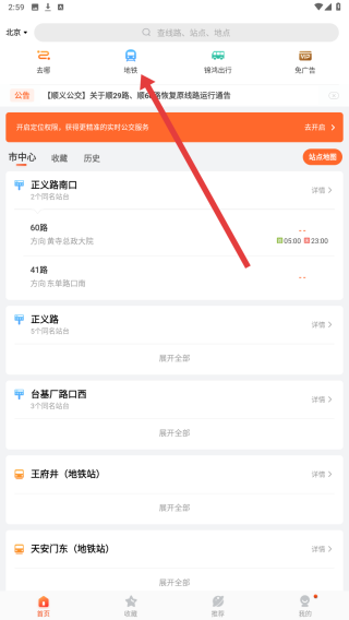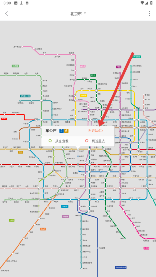 2、进入北京地铁线路图后,点击附近站点功能,快速定位当前位置周边的地铁站点,获取站点分布信息。