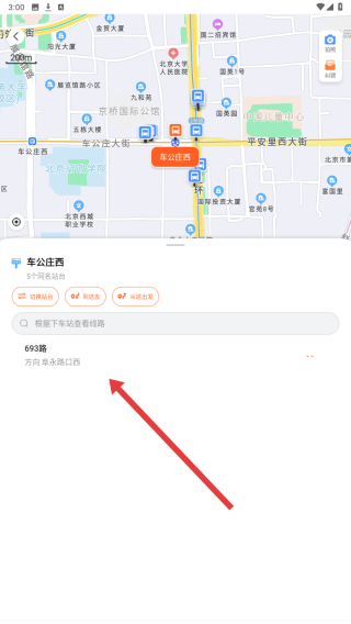 3、选定地铁站点如车公庄西后,查看该站点对应的公交信息,了解694路等公交线路的停靠情况,规划换乘方案。