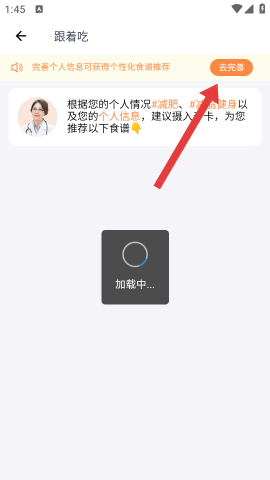 3、在跟着吃页面,点击顶部去完善按钮,进入个人信息完善界面。