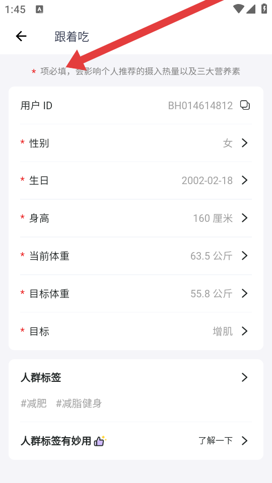 4、在个人信息完善界面,填写必填信息,完成后即可获得个性化食谱推荐,跟着推荐吃东西。