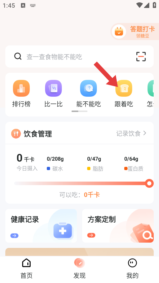 2、在发现的页面,来点击跟着吃的功能图标,进入跟着吃的页面。