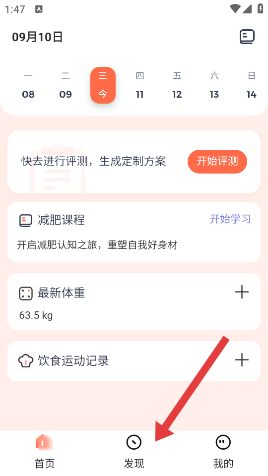 1、在薄荷营养师APP底部导航栏,需要点击发现,然后进入发现的页面。