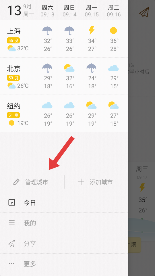 2、在侧边功能栏中,点击管理城市选项,进入地点管理的页面。