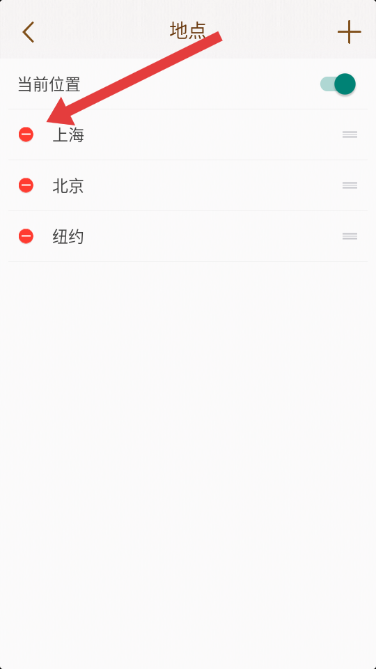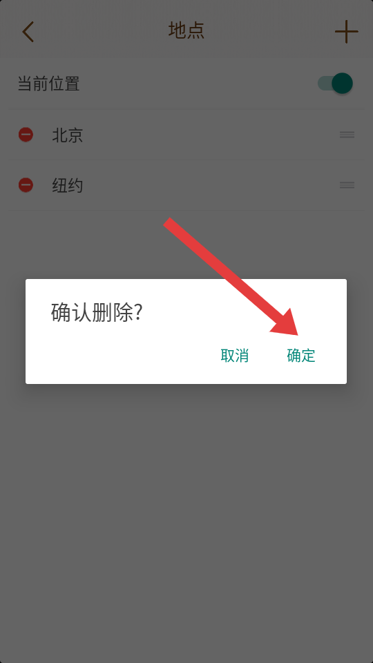 3、在地点管理页面,点击要删除城市左侧的减号按钮,触发删除确认弹窗。