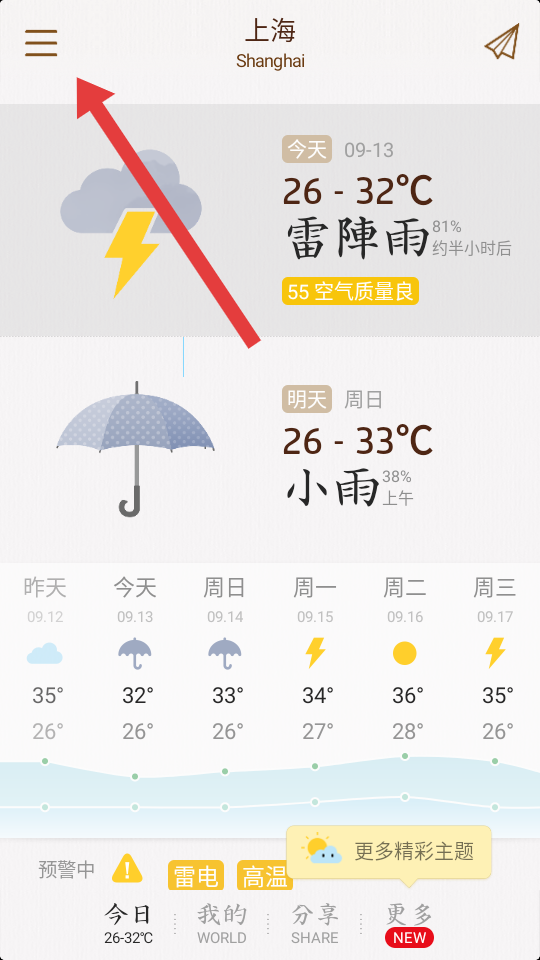 1、在我的天气主界面,点击左上角的三条横线菜单按钮,展开侧边功能栏。