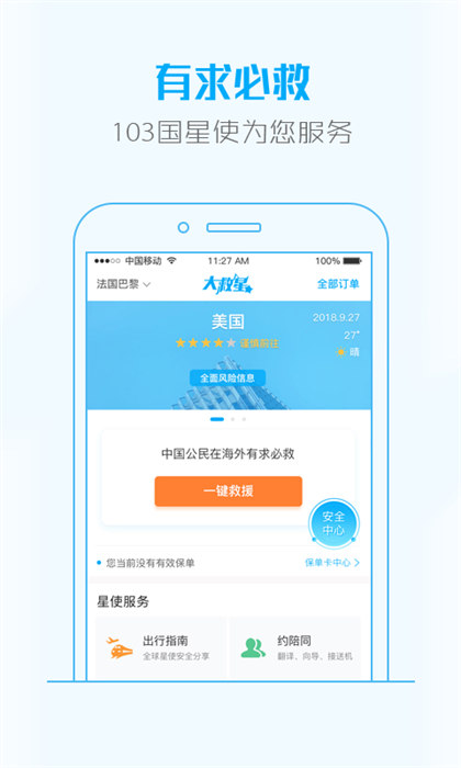 大救星中国公民全球领先救援平台; 一键救援在您身边,出行过程中遇到危险,只需要一键求助,系统将您的求助信息发送到附近的当地服务者,服务者将在20分钟之内到达您的身边,并协助处理您所需要的各种服务。