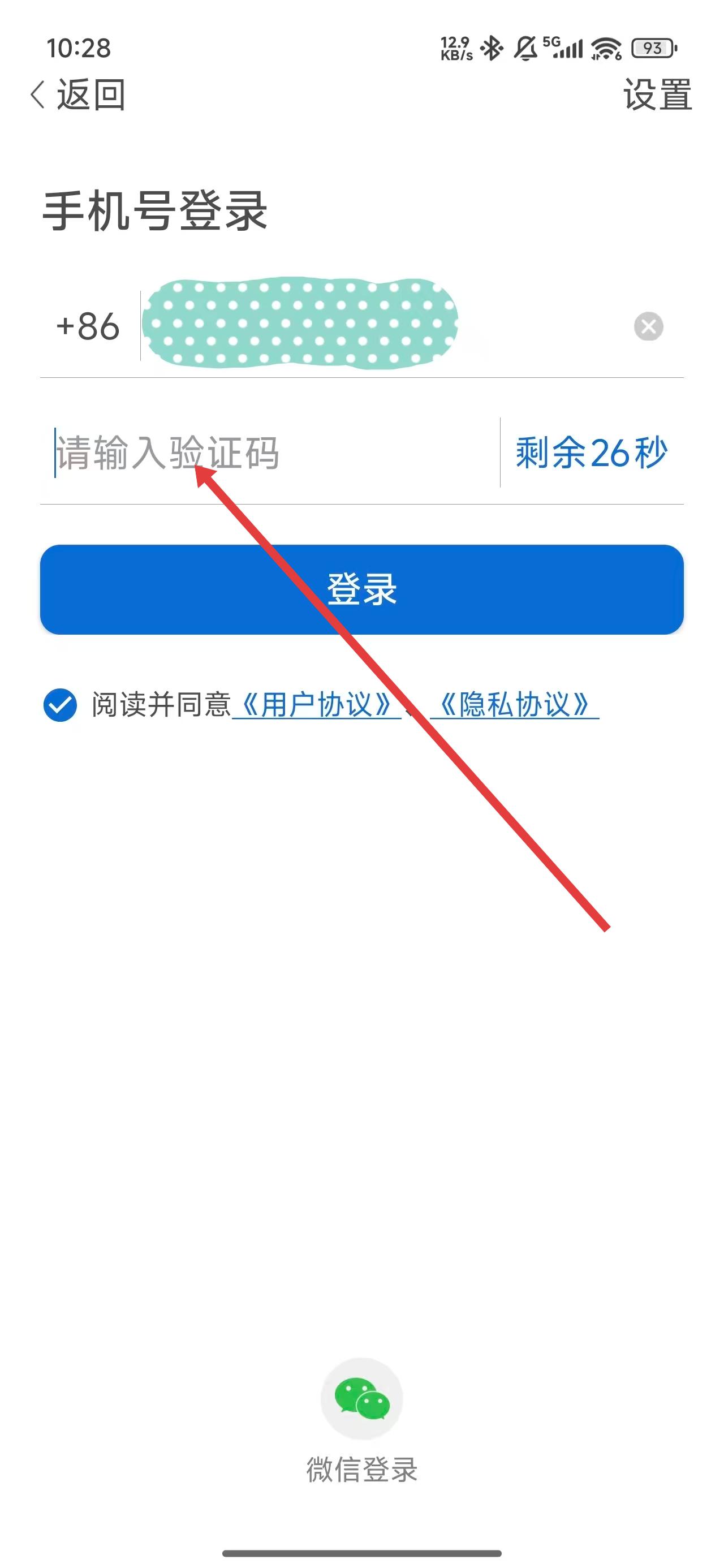 3、跳转到手机号登录界面时,点击输入框填写手机号以便获取验证码。