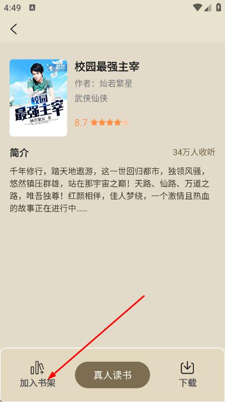 4、在书籍详情页面,点击加入书架,将校园最强主宰加入书架。