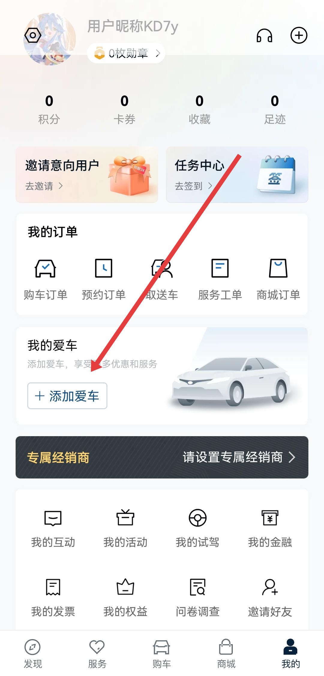 1、进入APP我的页面,在我的爱车区域点击+添加爱车,启动车辆绑定操作流程。