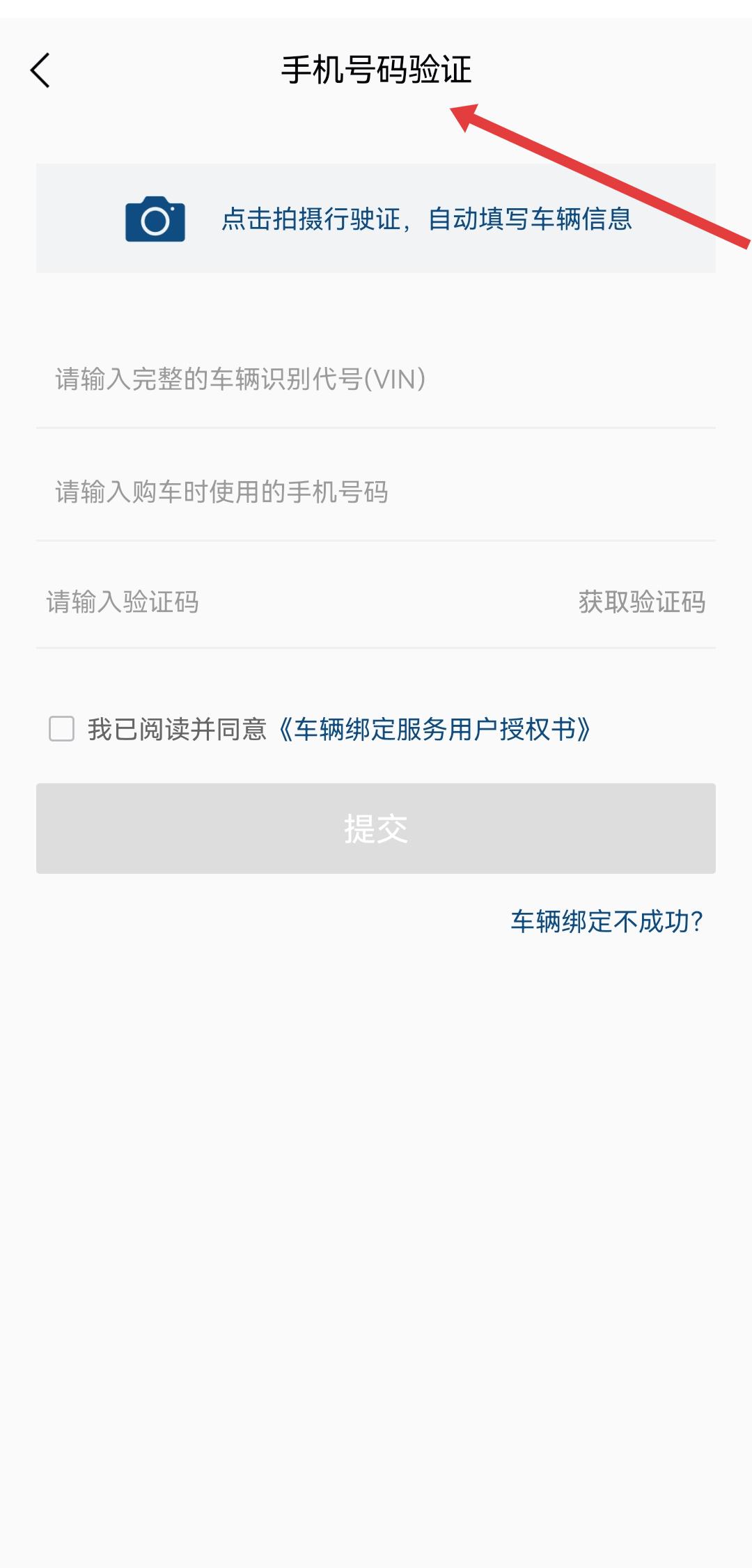 3、选择手机号码验证时,填写车辆识别代号、购车手机号,获取并输入验证码,勾选协议后点提交完成绑定。