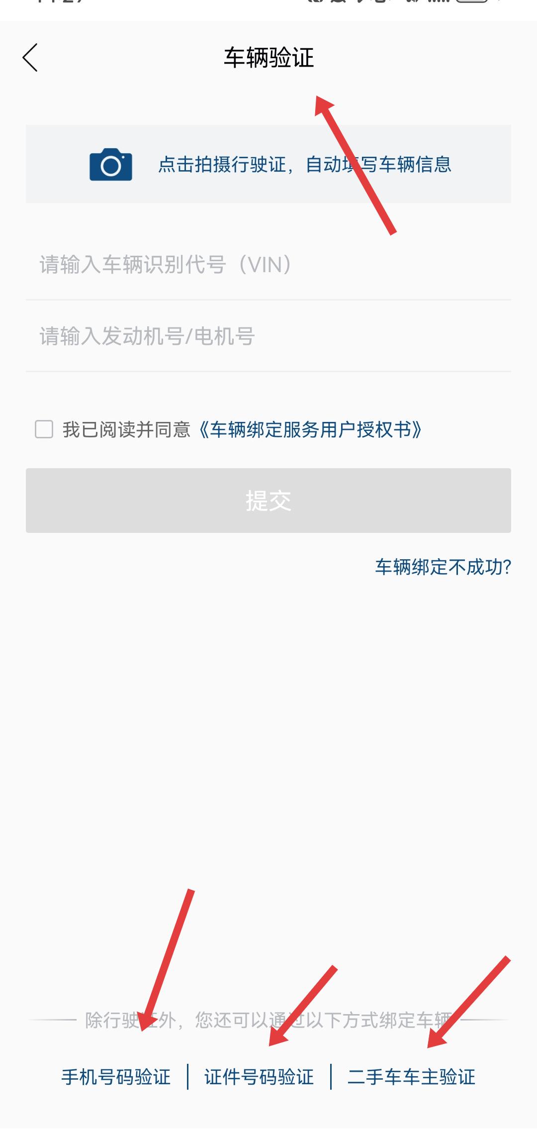 2、进入车辆验证的界面后,除拍摄行驶证外,可以选择手机号码验证、证件号码验证、二手车车主验证任一方式绑定。