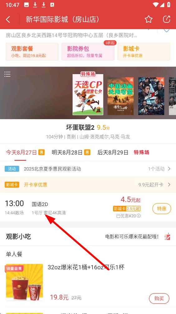 3、点击进入影片详情页,查看影片信息,选好观影日期、场次。