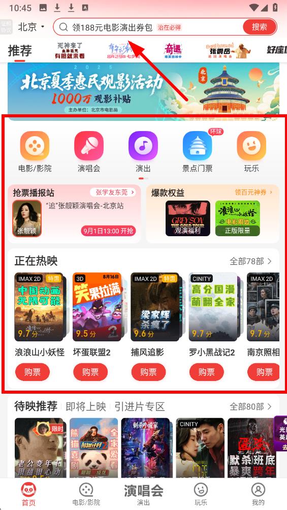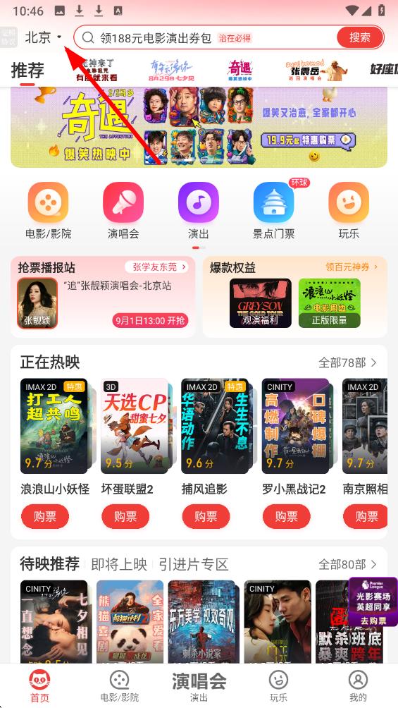 1、进入猫眼电影APP首页,点击左上角城市名称,可切换购票城市,按需选择观影城市后,回到首页用顶部搜索栏查找影片或影院。