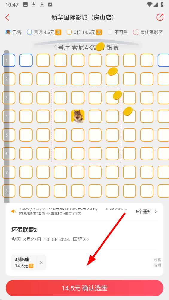 4、转选座界面,选择心仪的座位,选座后点确认选座,按提示完成支付,即可购买电影票。