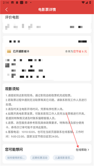 5、针对订单您可以联系影院或者跟在线客服沟通
