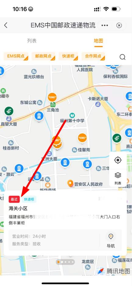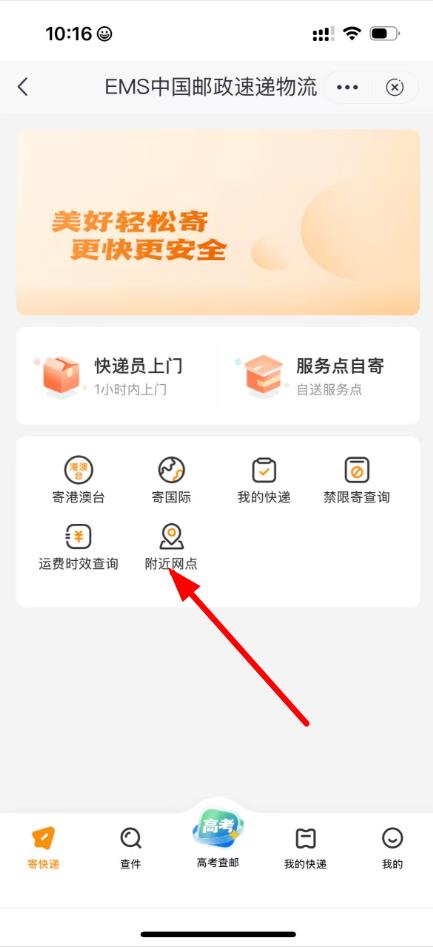 2、在搜索结果中找到快递服务并进入,在EMS中国邮政速递物流页面点击附近网点选项。