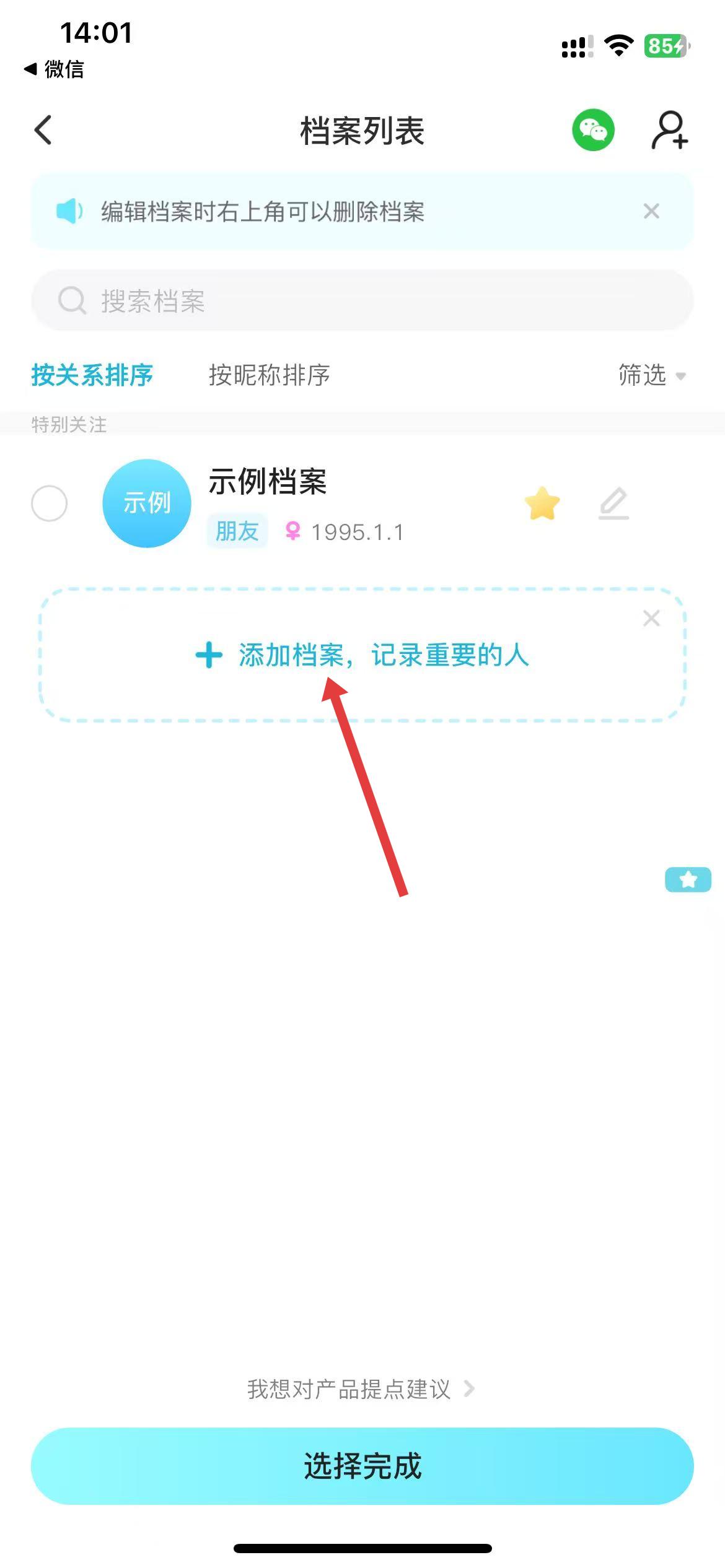 2、点击右上角添加档案,按照提示填写相关信息完成档案创建。