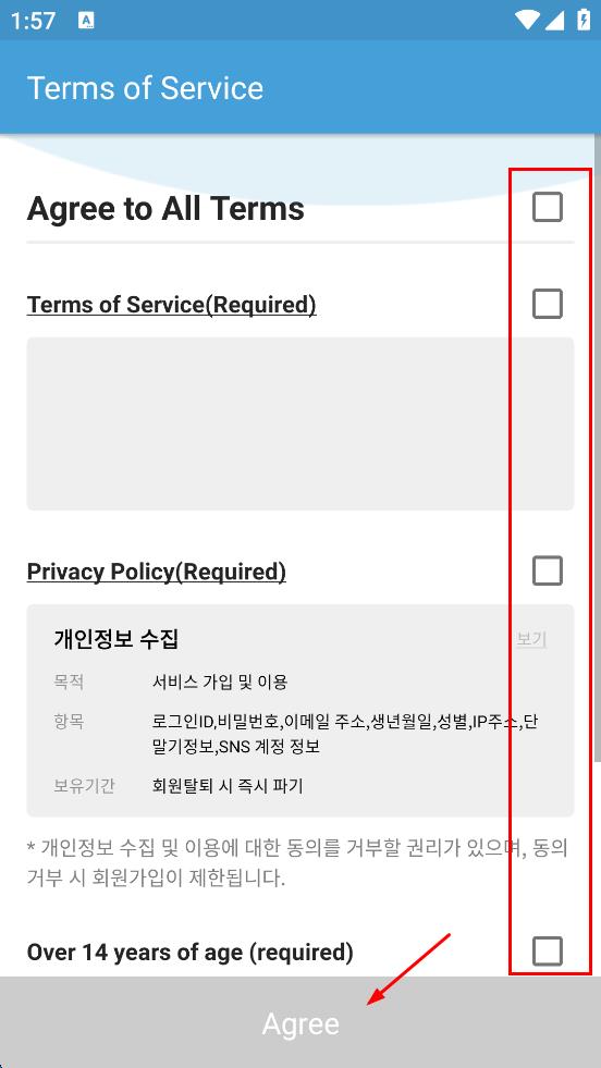 1、进入服务条款页面,勾选选项,然后点击“Agree”按钮,完成条款同意。