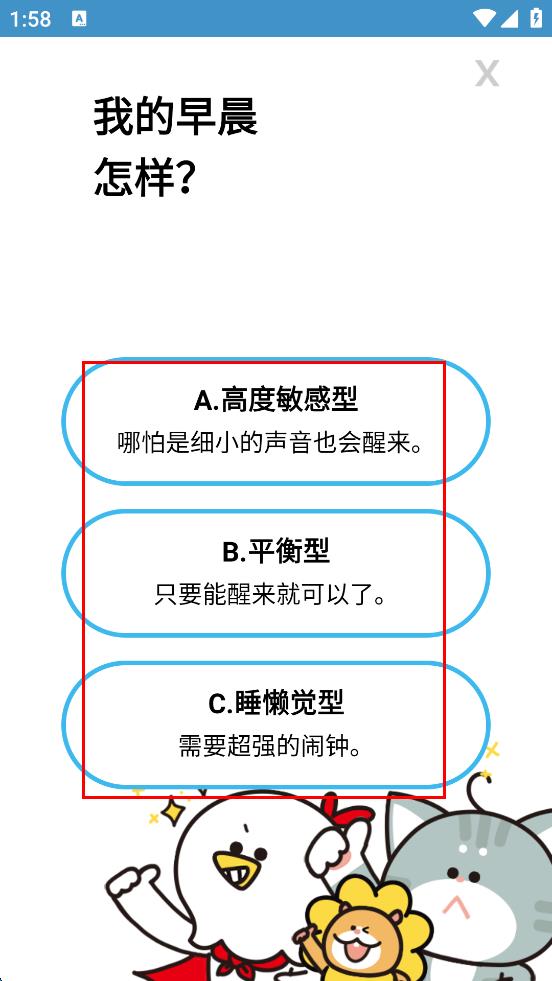 3、在“我的早晨怎样?”页面,根据自身情况,从“A.高度敏感型”“B.平衡型”“C.睡懒觉型”中选择一个选项。