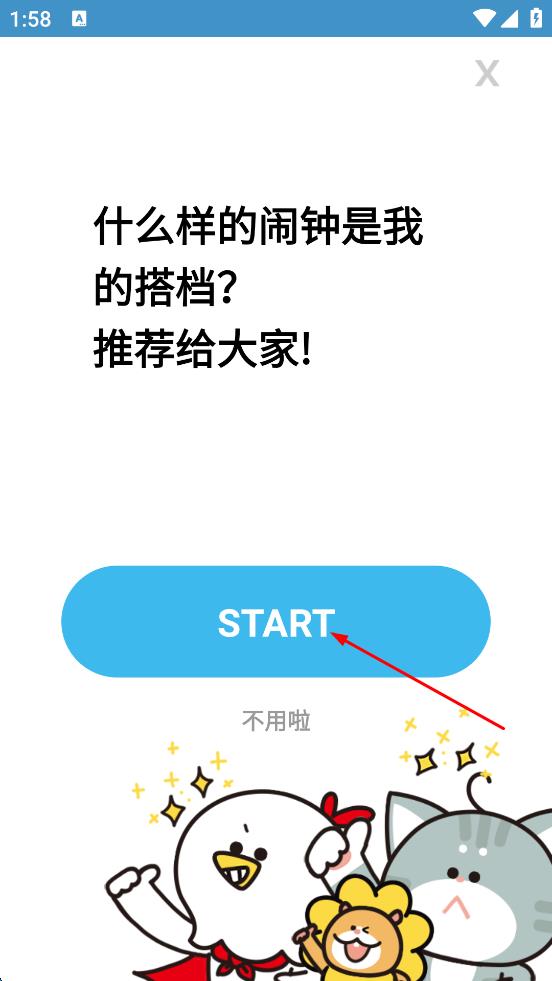 2、在弹出的推荐闹钟相关页面,点击“START”按钮,进入关于早晨情况的选择页面。
