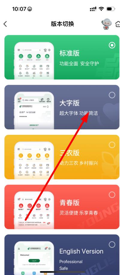 2、在版本切换页面中,浏览可供选择的版本,如标准版大字版三农版等,选择想要切换的大字版等版本,点击其对应的区域。