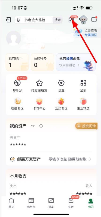 1、打开中国邮政软件,进入我的页面,点击右上角版本切换图标。