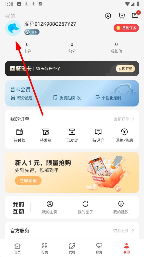 1、打开OPPO商城点击我的,进入页面后点击头像区域-进入账号相关界面。