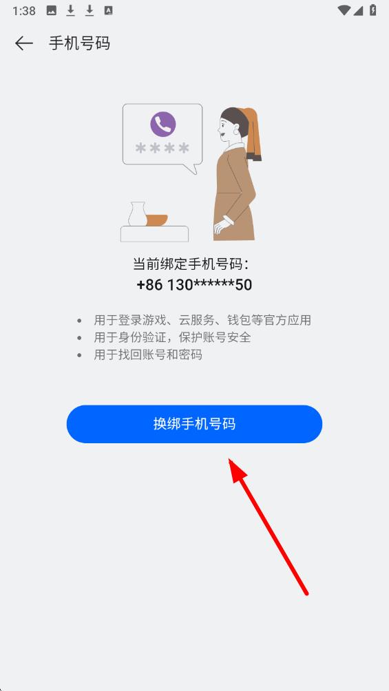 4、接着点击换绑手机号码按钮,按照提示完成身份验证等操作,即可换绑手机号。