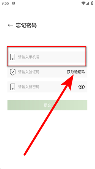 3、在忘记密码页面,输入手机号,点击获取验证码。