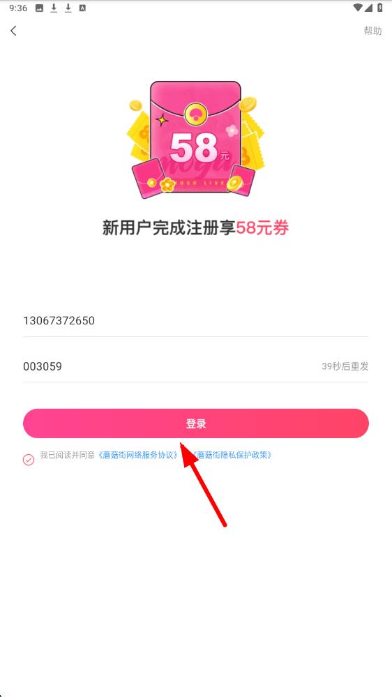 3、收到验证码后,在请输入验证码处填入正确的验证码,勾选下方我已阅读并同意协议,最后点击登录按钮,即可完成新账号注册。