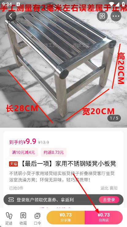 4、点击商品进入详情页,可查看尺寸等信息,若要自购,可点击自购返按钮。