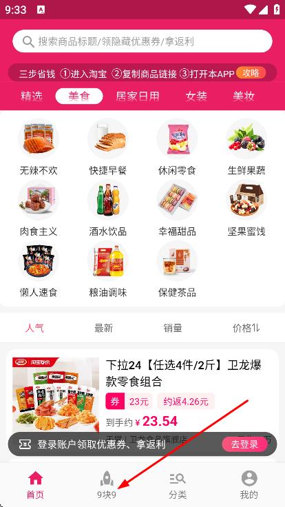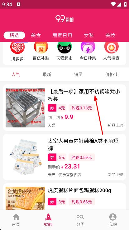3、进入9块9页面后,能看到各类商品,可查看商品的信息。