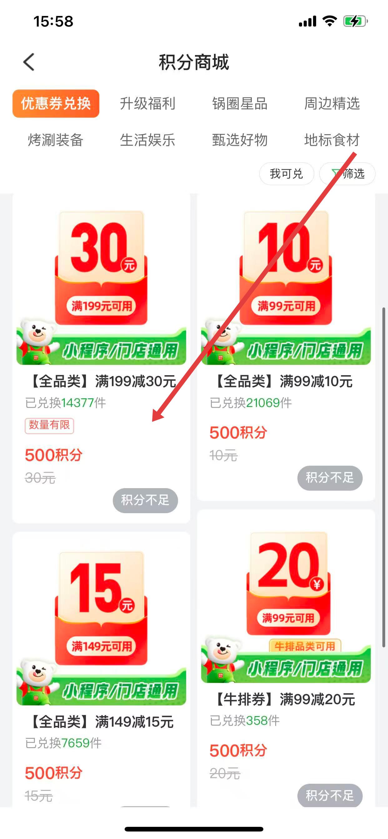 2、进入积分兑换优惠券界面后,浏览可兑换的优惠券列表,满199减30元、满99减10元等优惠券。